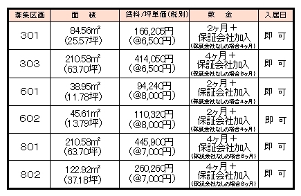 備考 | ※賃 料 ①96,200円(別途消費税) ②69,500円(別途消費税) ※共益費 ①19,240円(別途消費税) ②13,900円(別途消費税) ※電気料 専用子メーター検針により請求 |