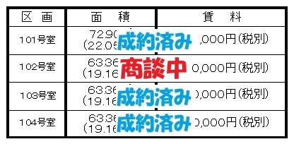 | 備考 | ※賃 料 ①96,200円(別途消費税) ②69,500円(別途消費税) ※共益費 ①19,240円(別途消費税) ②13,900円(別途消費税) ※電気料 専用子メーター検針により請求 |